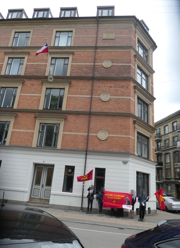 Aktivister fra Antiimperialistisk Kollektiv stod foran den chilenske ambassade med et banner med parolen »Leve det chilenske folks kamp!« og delte løbesedler ud imod angreb på lejren.