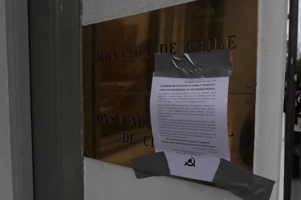 Vi har modtaget dokumentation for at en solidaritetsmanifestation har fundet sted foran den Chiles Ambassade mod usmidningen af mere end 200 familier fra »Toma 17 de Mayo«.