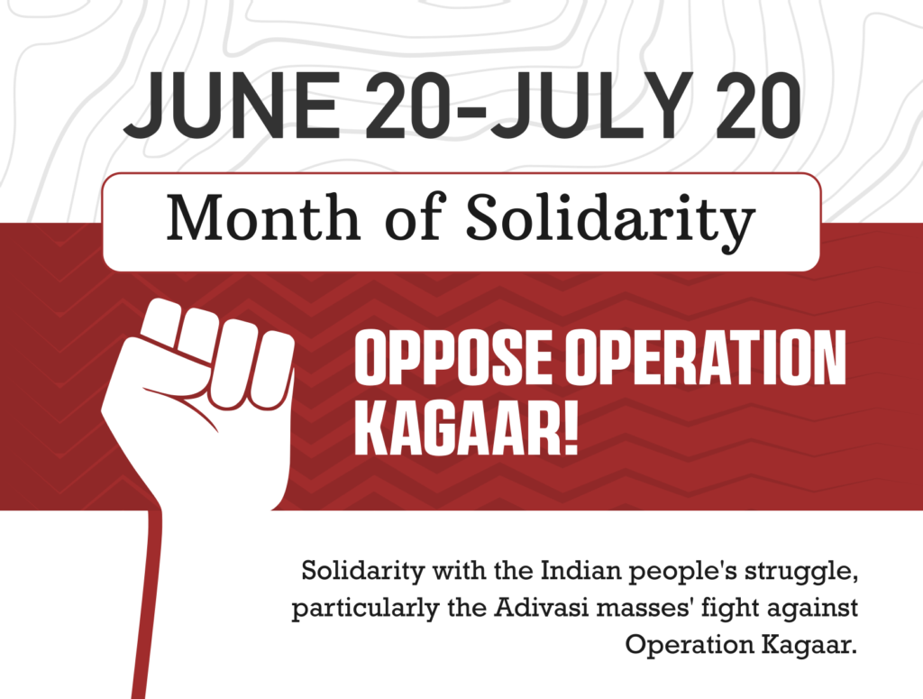 Centralkomiteen i Filippinernes Kommunistiske Parti erklærede for nylig 20. juni-20. juli for en Solidaritetsmåned for det indiske folks kamp, især adivasi-massernes kamp imod Operation Kagaar. I tråd med dette dedikerer PRWC (Philippine Revolution Web Central) en side til at samle alle relaterede artikler, udtalelser og dokumenter om det indiske folks kamp.