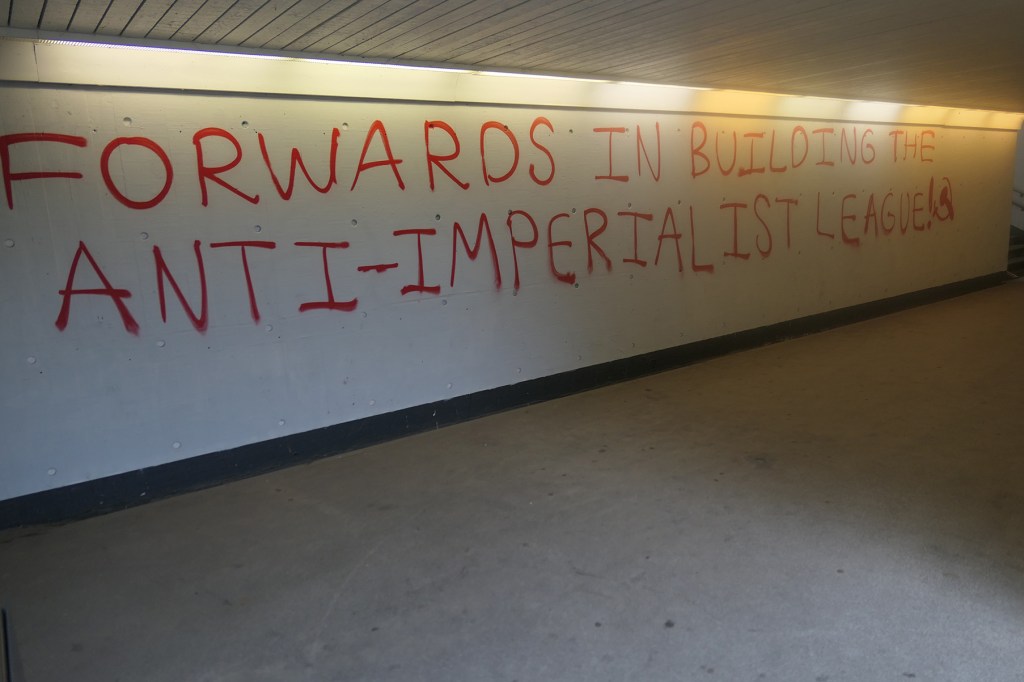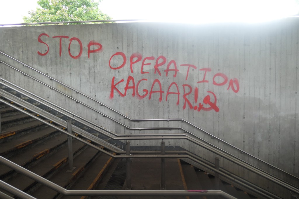 Ved Taastrup Station, nær flere proletariske nabolag, blev paroler malet til støtte for Folkekrigeen i Indien:
