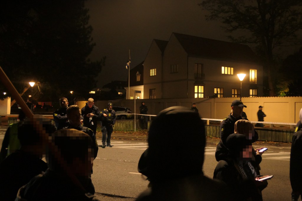 Foran ambassaden forlangte politiet at hele demonstrationen skulle stille sig mellem et hegn mod jernbanen og polititape, som politiet havde sat op. Dette ville efterlade kun 3-4 meter mellem hegnet og politiets tape, med kun én udvej. Demonstrationen afviste klart politiets absurde krav, hvor efter politiet valgte at eskalere situationen ved at chikanere demonstrationens arrangører og true med at opløse den lovlige protest. Demonstrationen forblev trodsig og det endte med at politiet gav sig og fjernede deres, tape så demonstrationen fik mere plads.