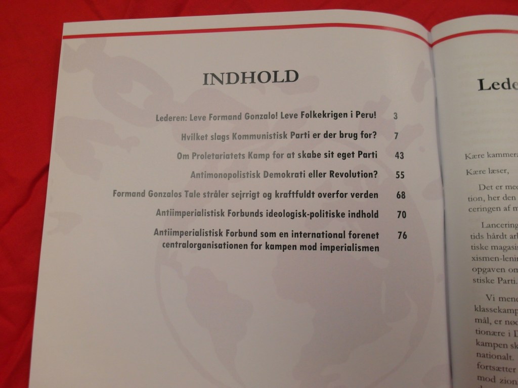 Vi har valgt at lancere vores magasin her den 3. december fordi, datoen er 90-årsdagen for Formand Gonzalos fødsel, Føreren af Folkekrigen i Peru og af den nye store bølge af den Proletariske Verdensrevolution, og 41-årsdagen for stiftelsen af Folkebefrielseshæren i Peru. Vi ønsker, med denne dato, at markere vores magasins marxistisk-leninistisk-maoistiske, Gonzalo tænknings-karakter og at fremhæve vigtigheden af Formand Gonzalo og PCP, når det kommer til spørgsmålet om det Kommunistiske Parti, som i Danmark skal rekonstitueres, og som dette første nummer af vores magasins hovedartikel vil handle om.