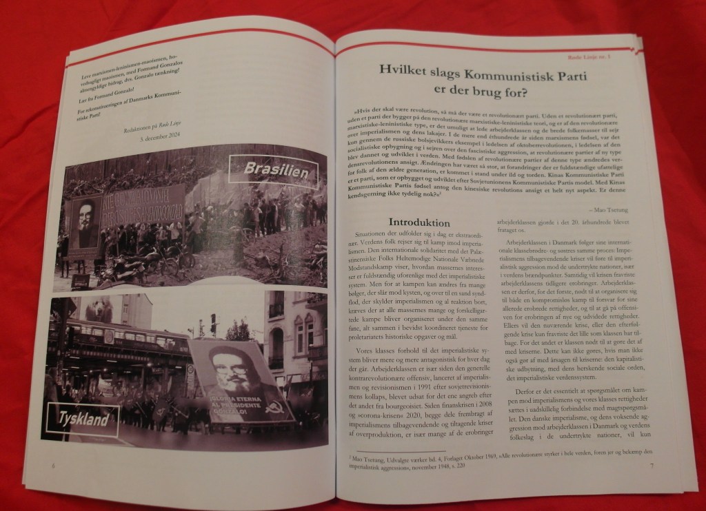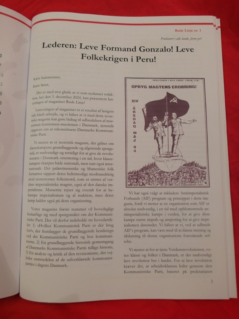Det er med stor proletarisk jubel at vi kan bringe nyheden om lanceringen af et nyt Maoistisk Magasin i Danmark. Magasinet »Røde Linje« og dets redaktion har valgt at lancere sig den 3. december 2024 i anledningen af 90-årsdagen for Formand Gonzalos fødsel og 41-årsdagen for stiftelsen af Folkebefrielseshæren i Peru. Vi har modtaget en kopi af første offentlige udgave af magasinet og har med redaktionens tilladelse reproduceret lederartiklen som vi deler nedenfor.