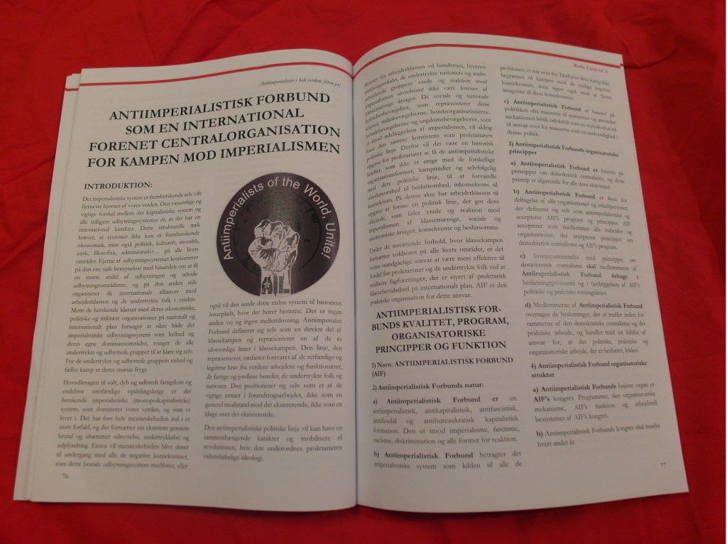 Vi har også valgt at inkludere Antiimperialistisk Forbunds (AIF) program og principper i dette magasin, fordi vi mener at en organisation som AIF er absolut nødvendig, i en tid med opblomstrende antiimperialistiske kampe i verden, for at give disse kampe større impuls og ansporing for at give imperialismen døsstødet. Vi håber at vi, ved at udbrede AIF’s program, kan være med til at danne mening og tilslutning til denne organisations forestående stiftelse.