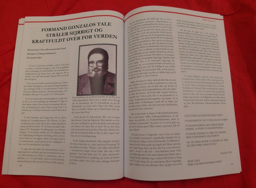 Vi hædrer derfor Formand Gonzalo ved at lancere vores magasin, som hedder Røde Linje, fordi der netop er behov for en Rød Linje, for revolutionære i Danmark at samles om, i vores ubønhørlige march hen mod rekonstitueringen af Danmarks Kommunistiske Parti og for indledningen af Folkekrigen i Danmark, tjenende Verdensrevolutionen, som Formand Gonzalo har lært os!