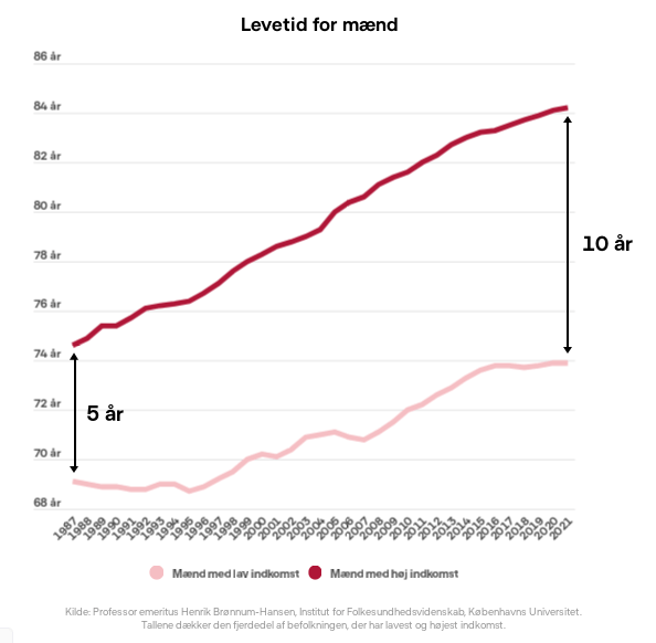 Hvad man dog ser er, at for det første er den forventede levealder i Danmark stagnerende. For det andet skelnes der ikke mellem klasser, når udregning af gennemsnitslevealderen i Danmark tages i betragtning: De laveste indkomstgrupper lever i gennemsnit 10 år mindre end de højeste indkomstgrupper i Danmark. Tendensen viser desuden at forskellen i gennemsnitslevealderen mellem rig og fattig hverken bliver mindre eller forbliver den samme – den er stigende: i 1987 var forskellen i gennemsnitslevealder mellem rig og fattig nemlig kun 5 år. Det vil sige at for den rigeste del af befolkningen vil pensionsårene i gennemsnit vare længere, selvom pensionsalderen stiger, mens den vil blive mindre og mindre for den dybeste og bredeste del af folket.Det vil i praksis betyde at pensionsårene vil blive færre for den laveste del af befolkningen. Sandsynligvis vil de år også være af ringere kvalitet, fordi selvom folk i gennemsnit bliver ældre lige nu, er der intet bevis på at livskvaliteten af de sidste år bliver meget bedre, specielt når flere skal bruges på at arbejde.