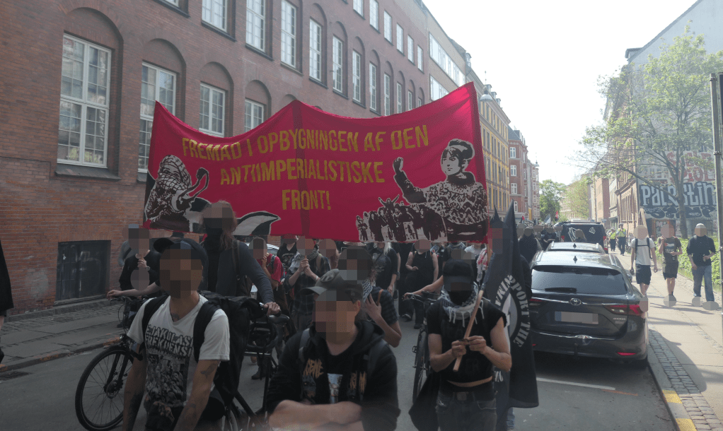 At the demonstration, Anti-Imperialist Action also carried a large banner depicting Palestinian freedom fighters and Inuit from Greenland with the slogan “Forward in the construction of the Anti-Imperialist Front!”.