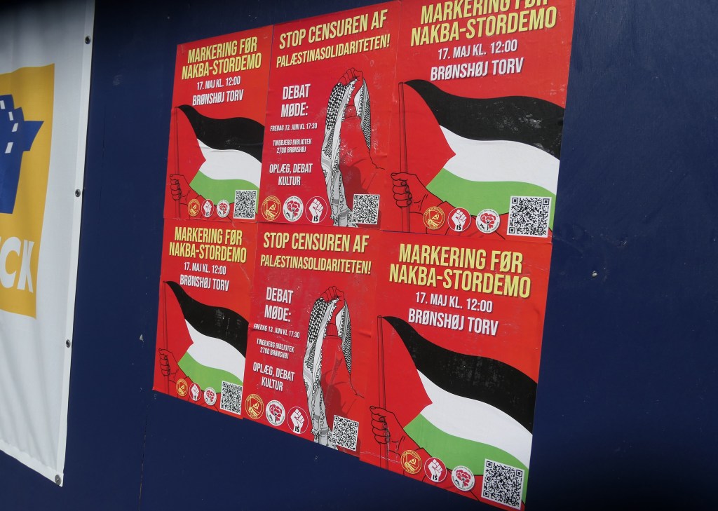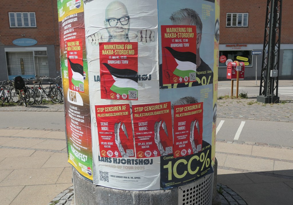 Plakaterne fortæller bl.a. at der vil finde en lokal markering sted den 17. maj kl 12:00 på Brønshøj Torv i anledning af Nakba-dagen.
