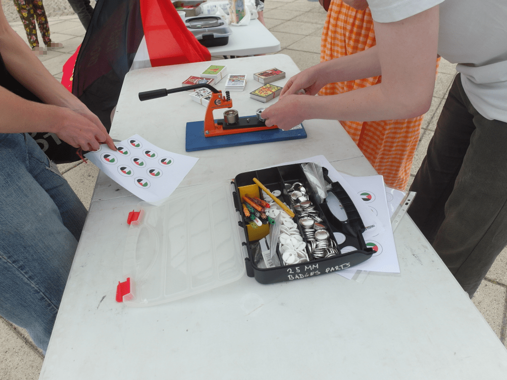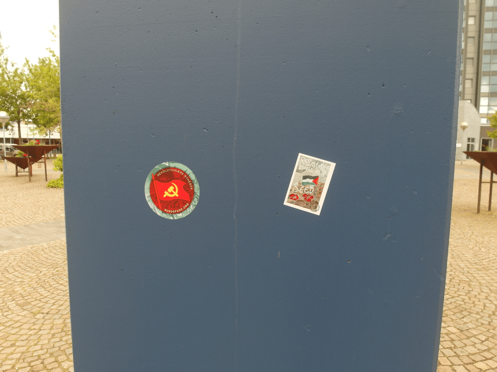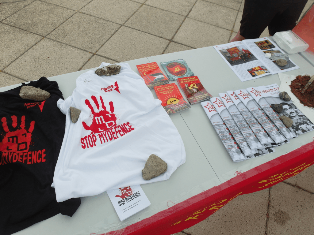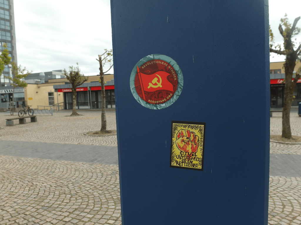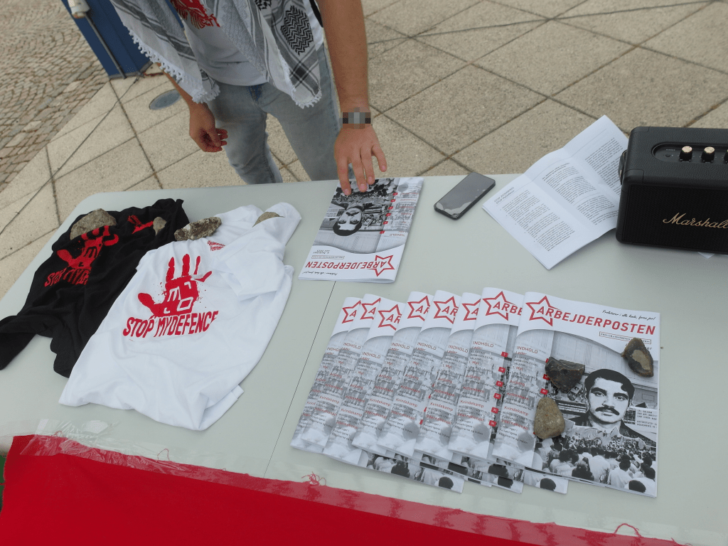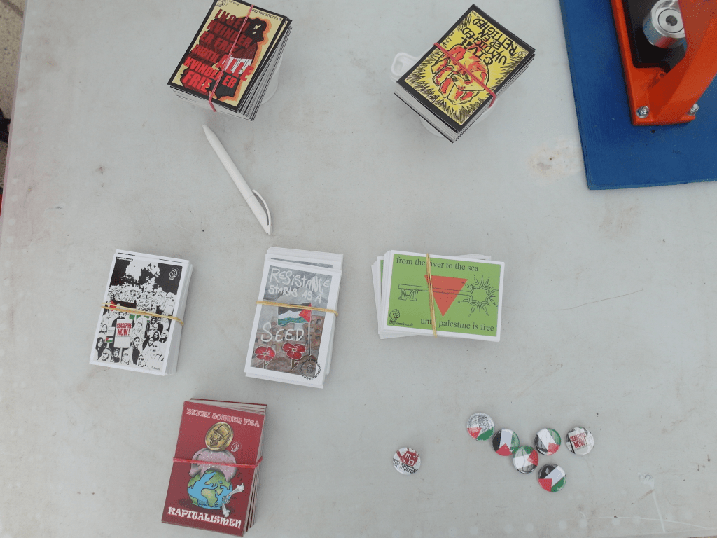 Klistermærkernes emner var også gode samtalepunkter for aktivisterne og de besøgende, omkring blandt andet solidariteten med Palæstina, proletarisk feminisme, LCP’s væbnede kamp i Brasilien, og danmarks revolutionære nyhedsmedie »Røde Fane« (rødefane.org).