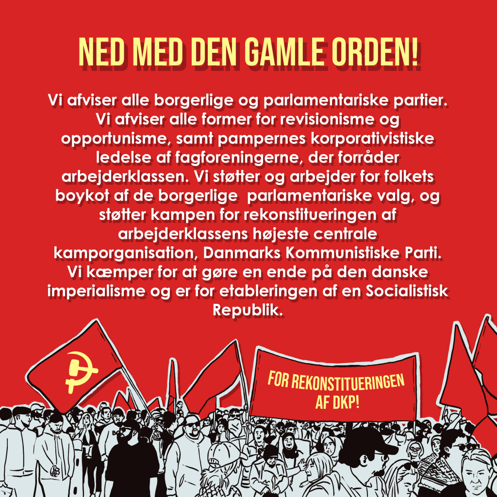 - Ned med den gamle orden! Vi afviser alle borgerlige og parlamentariske partier. Vi afviser alle former for revisionisme og opportunisme, samt pampernes korporativistiske ledelse af fagforeningerne, der forråder arbejderklassen. Vi støtter og arbejder for folkets boykot af de borgerlige parlamentariske valg, og støtter kampen for rekonstitueringen af arbejderklassens højeste centrale kamporganisation, Danmarks Kommunistiske Parti. Vi kæmper for at gøre en ende på den danske imperialisme og er for etableringen af en Socialistisk Republik.