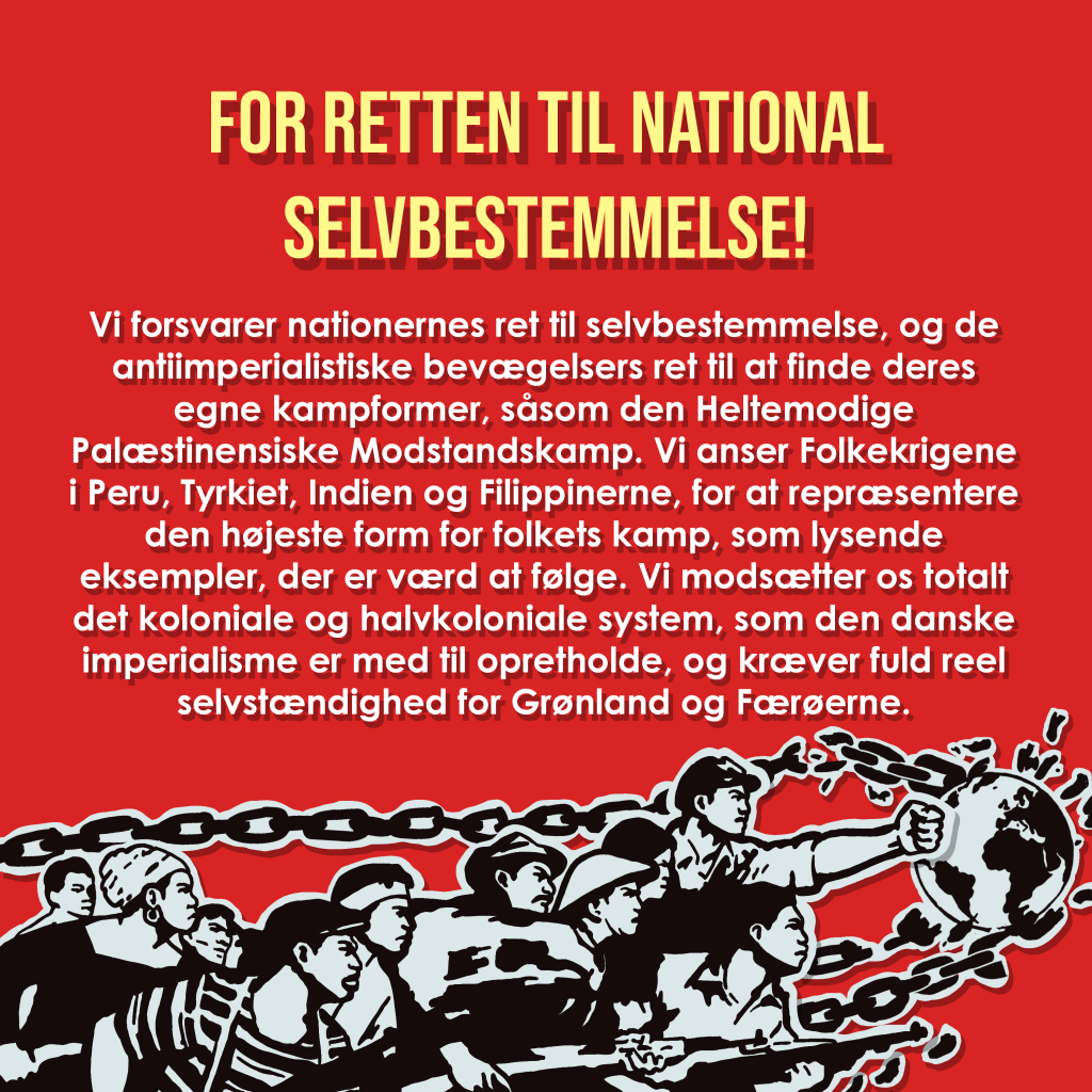 - For retten til national selvbestemmelse! Vi forsvarer nationernes ret til selvbestemmelse, og de antiimperialistiske bevægelsers ret til at finde deres egne kampformer, såsom den Heltemodige Palæstinensiske Modstandskamp. Vi anser Folkekrigene i Peru, Tyrkiet, Indien og Filippinerne, for at repræsentere den højeste form for folkets kamp, som lysende eksempler, der er værd at følge. Vi modsætter os totalt det koloniale og halvkoloniale system, som den danske imperialisme er med til opretholde, og kræver fuld reel selvstændighed for Grønland og Færøerne.