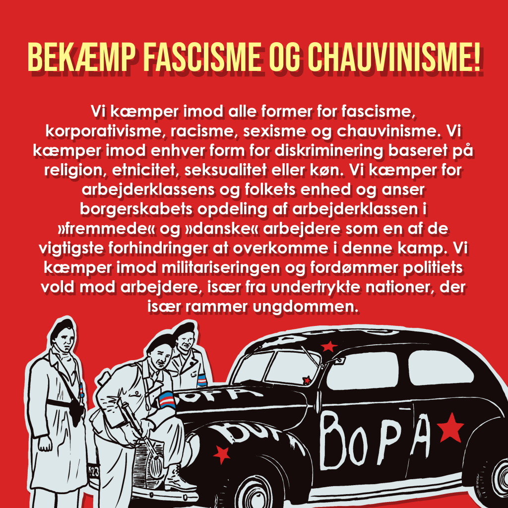 - Bekæmp fascisme og chauvinisme! Vi kæmper imod alle former for fascisme, korporativisme, racisme, sexisme og chauvinisme. Vi kæmper imod enhver form for diskriminering baseret på religion, etnicitet, seksualitet eller køn. Vi kæmper for arbejderklassens og folkets enhed og anser borgerskabets opdeling af arbejderklassen i »fremmede« og »danske« arbejdere som en af de vigtigste forhindringer at overkomme i denne kamp. Vi kæmper imod militariseringen og fordømmer politiets vold mod arbejdere, især fra undertrykte nationer, der især rammer ungdommen.