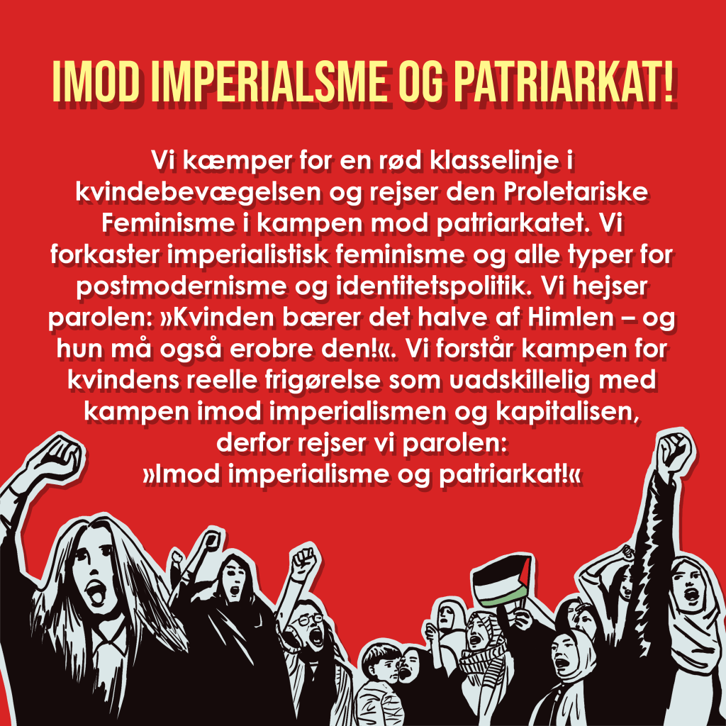 - Imod imperialisme og patriarkat! Vi kæmper for en rød klasselinje i kvindebevægelsen og rejser den Proletariske Feminisme i kampen mod patriarkatet. Vi forkaster imperialistisk feminisme og alle typer for postmodernisme og identitetspolitik. Vi hejser parolen: »Kvinden bærer det halve af Himlen – og hun må også erobre den!«. Vi forstår kampen for kvindens reelle frigørelse som uadskillelig med kampen imod imperialismen og kapitalisen, derfor rejser vi parolen: »Imod imperialisme og patriarkat!«.