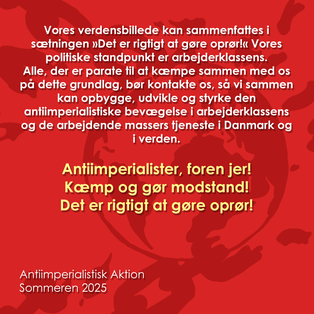 Alle, der er parate til at kæmpe sammen med os på dette grundlag, bør kontakte os, så vi sammen kan opbygge, udvikle og styrke den antiimperialistiske bevægelse i arbejderklassens og de arbejdende massers tjeneste i Danmark og i verden.