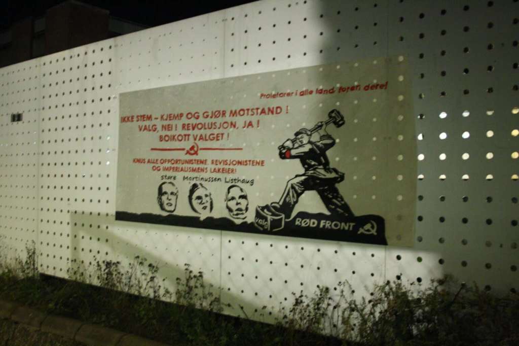 Kammeraterne skriver: Groruddalen i Oslo. På dazibaoene kan man læse slagordene »Ikke stem – Kæmp og gør modstand!«, »Valg, nei! Revolusjon, ja!«, »Knus alle opportunisterne, revisonisterne og imperialismens lakejer!« og »Boykot valget!«. Dazibaoerne er signert af Rød Front.