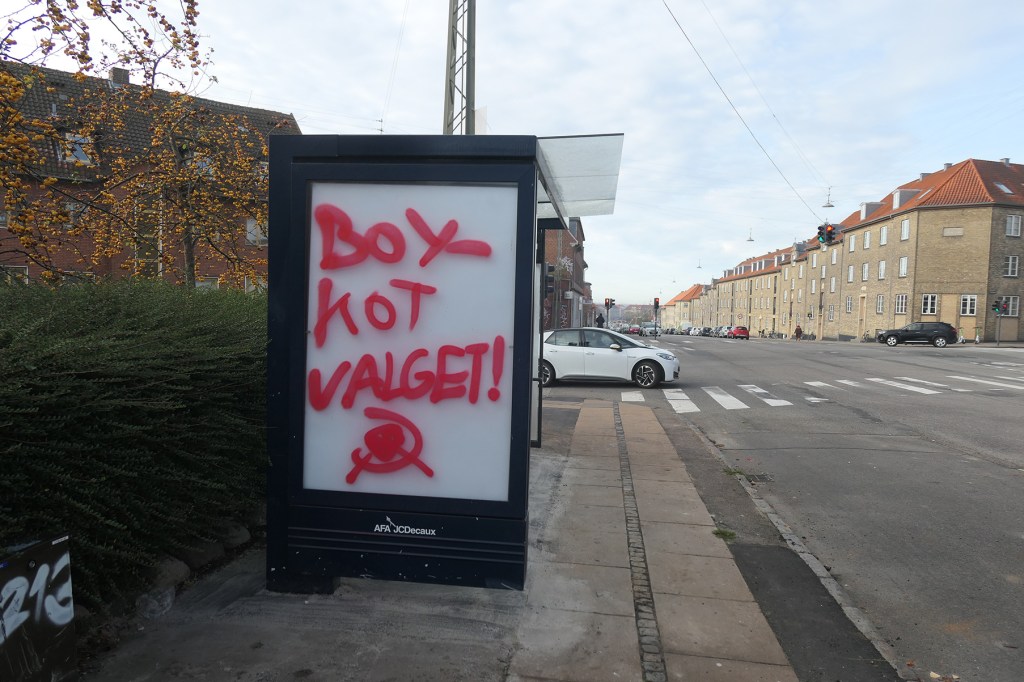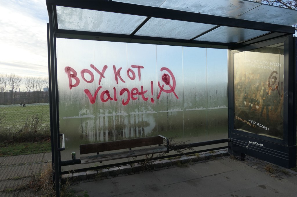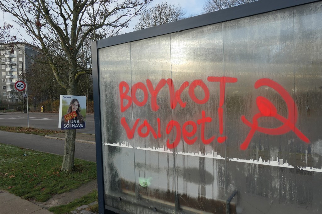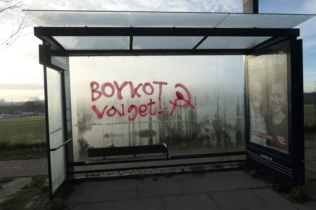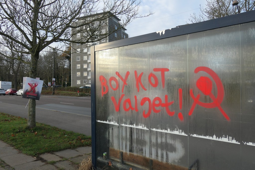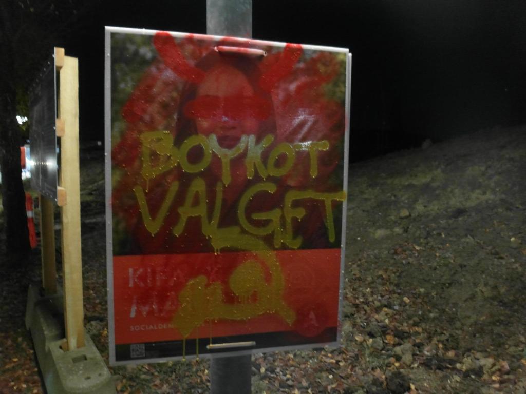 På den anden side er der også flere der både spontant og bevidst afviser valgfarcen. Vi deler her sabotage og propaganda imod den borgerlige valgfarce, som har fundet sted i flere arbejdernabolag og ved flere valgsteder i København.