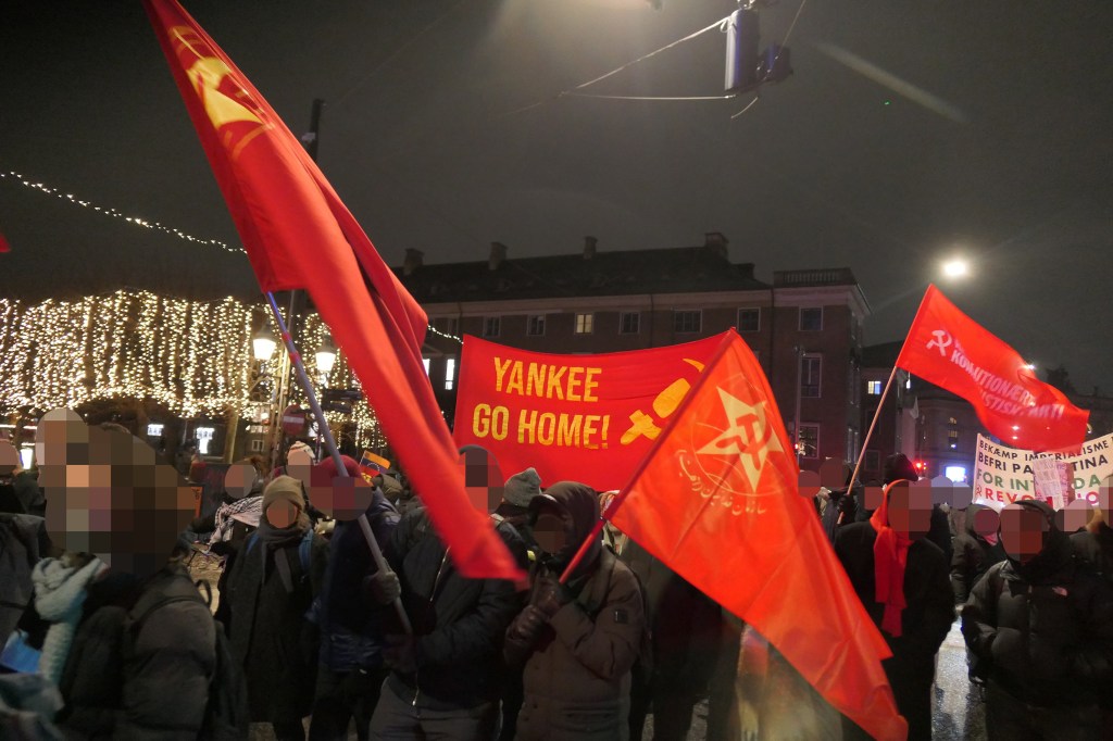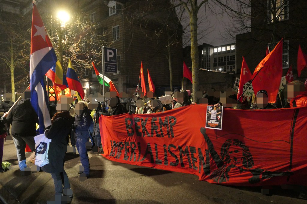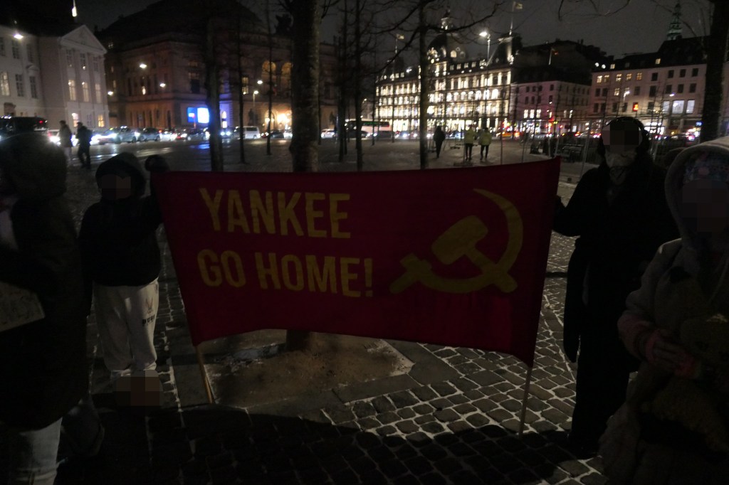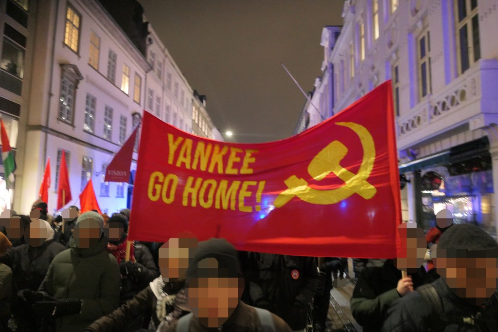 Vi deler en foto-rapport nedenfor, som er blevet sendt til os af aktivister fra Antiimperialistisk Aktion, som også deltog i demonstrationen. Til demonstrationen vajede et banner med parolen »Yankee go home!« og et hammer og segl.