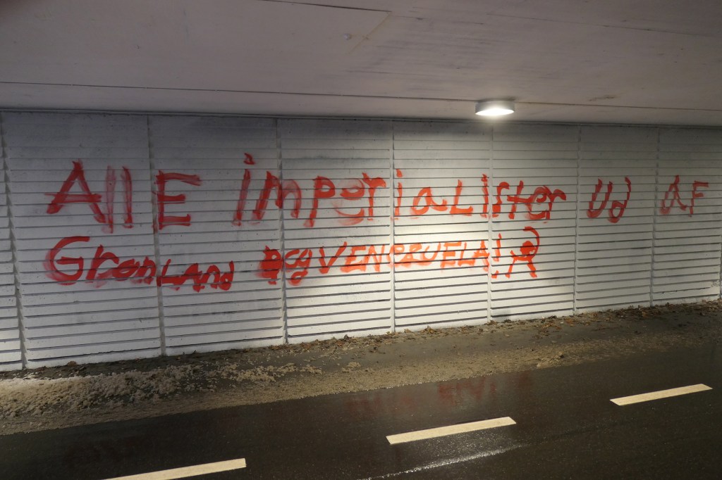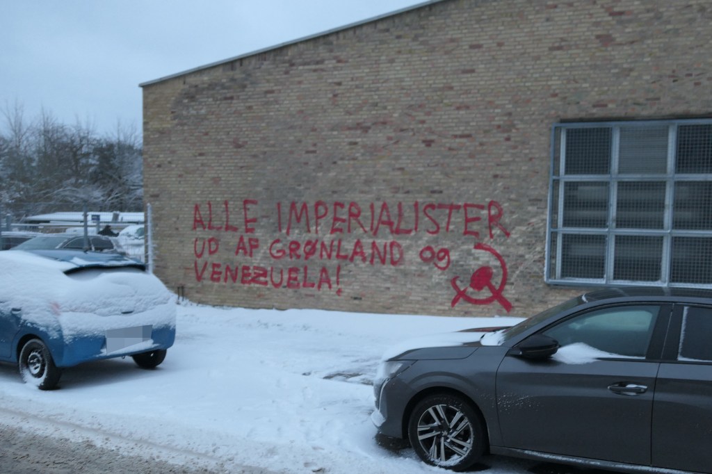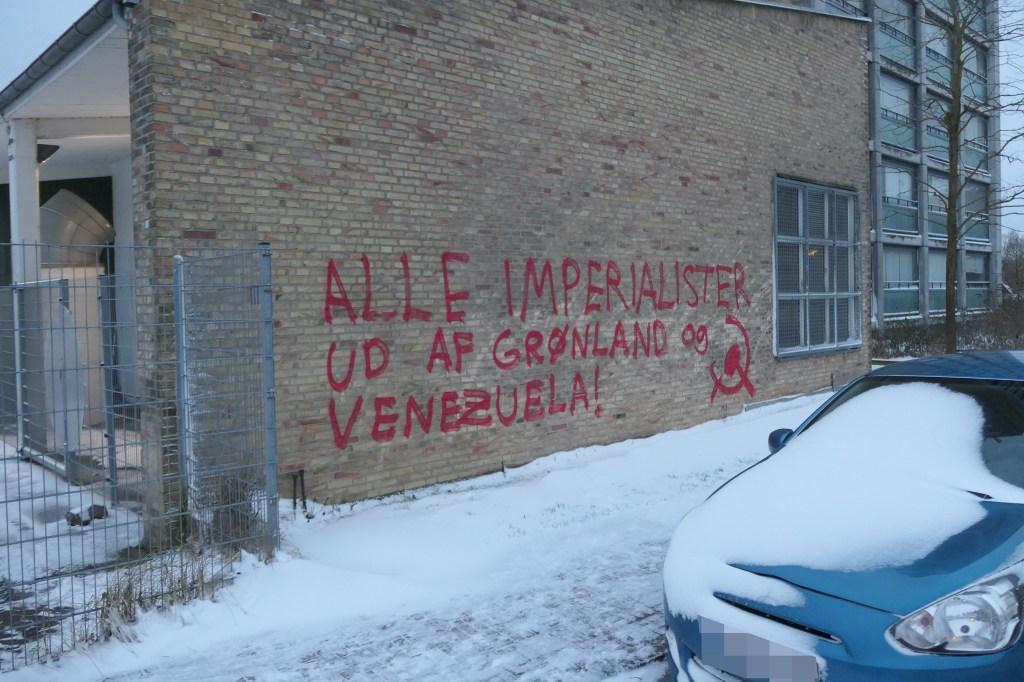 Flere steder er parolerne »Alle imperialister ud af Grønland og Venezuela!« blevet malet.