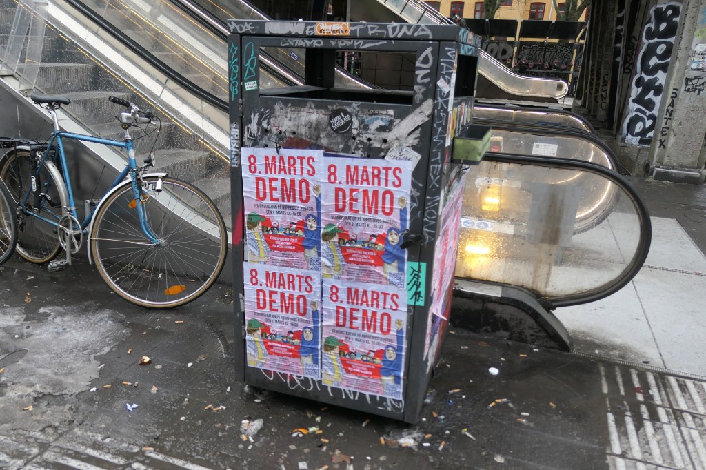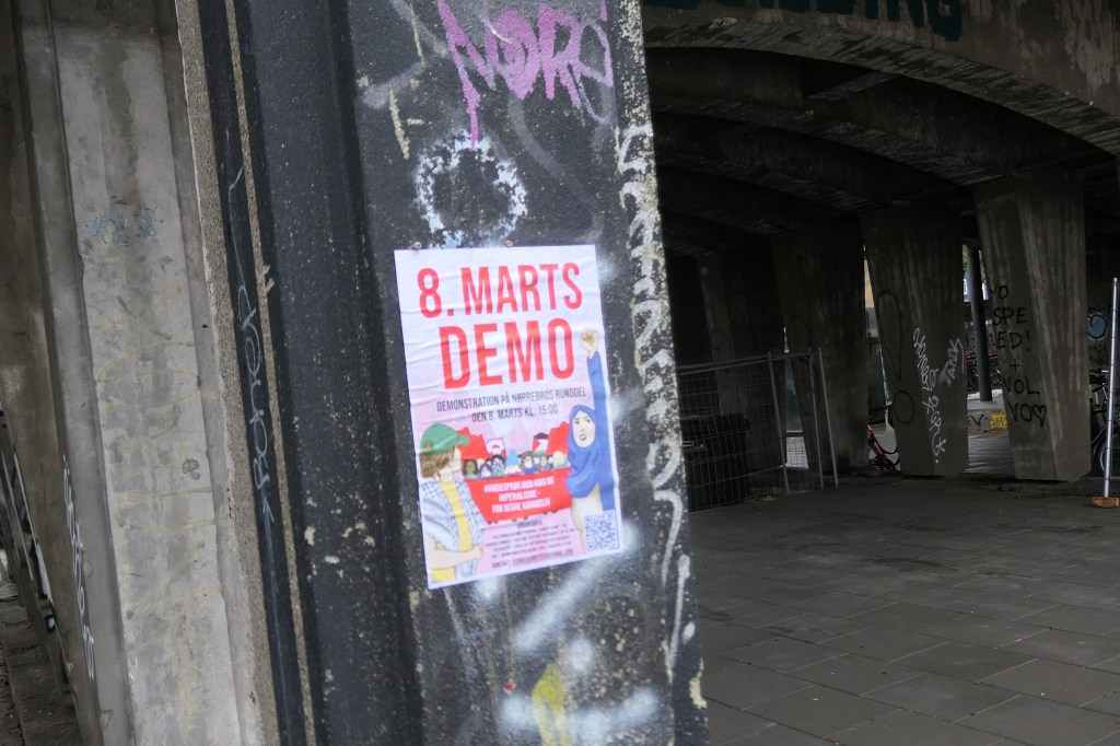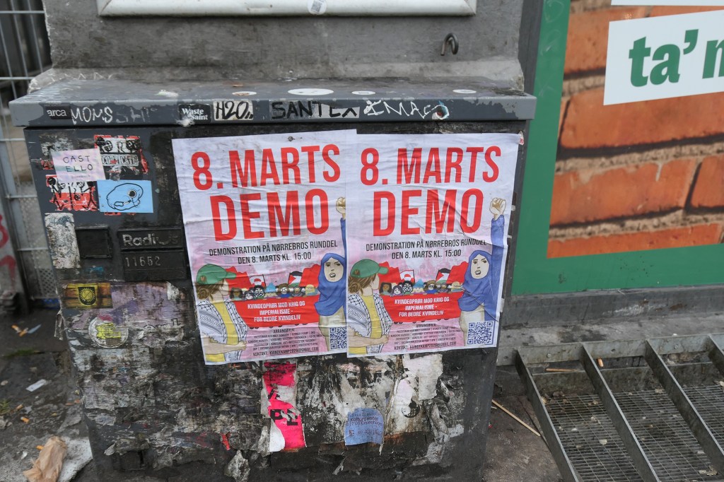 Vi har modtaget dokumentation for plakater for en 8. marts demonstration, der er blevet klæbet op omkring Nørrebro.
